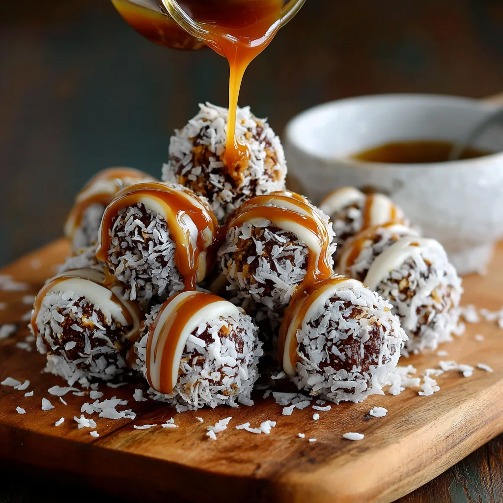 - Add Caramel: Flatten each truffle slightly. Spoon or drizzle caramel over the top, creating a gooey layer that will stick as the truffle sets.
