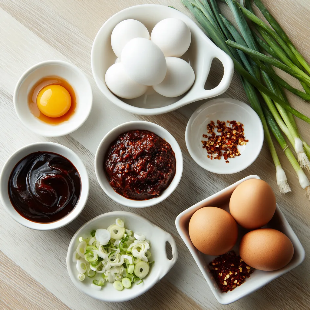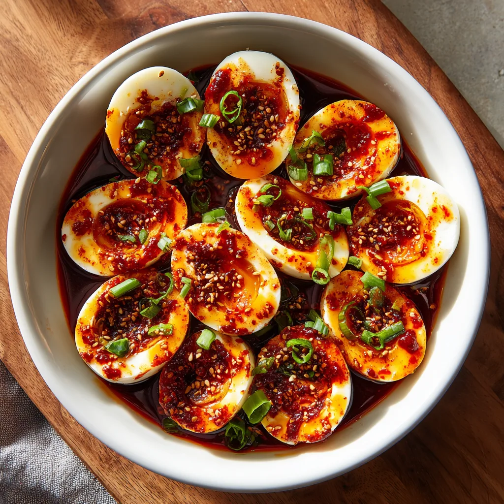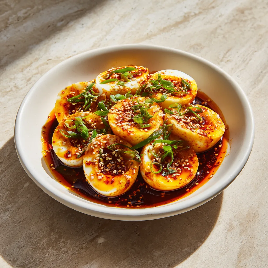 Soft-boiled eggs coated in a bold, spicy-sweet gochujang sauce with sesame and scallions. Quick, flavorful, and versatile.