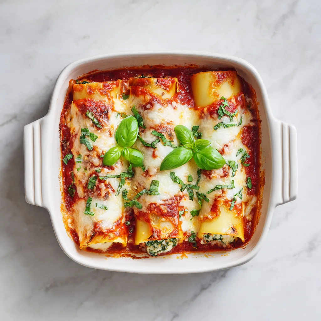 Baked cannelloni pasta filled with savory ground beef, spinach, and creamy cheeses, topped with tomato sauce and melted mozzarella.