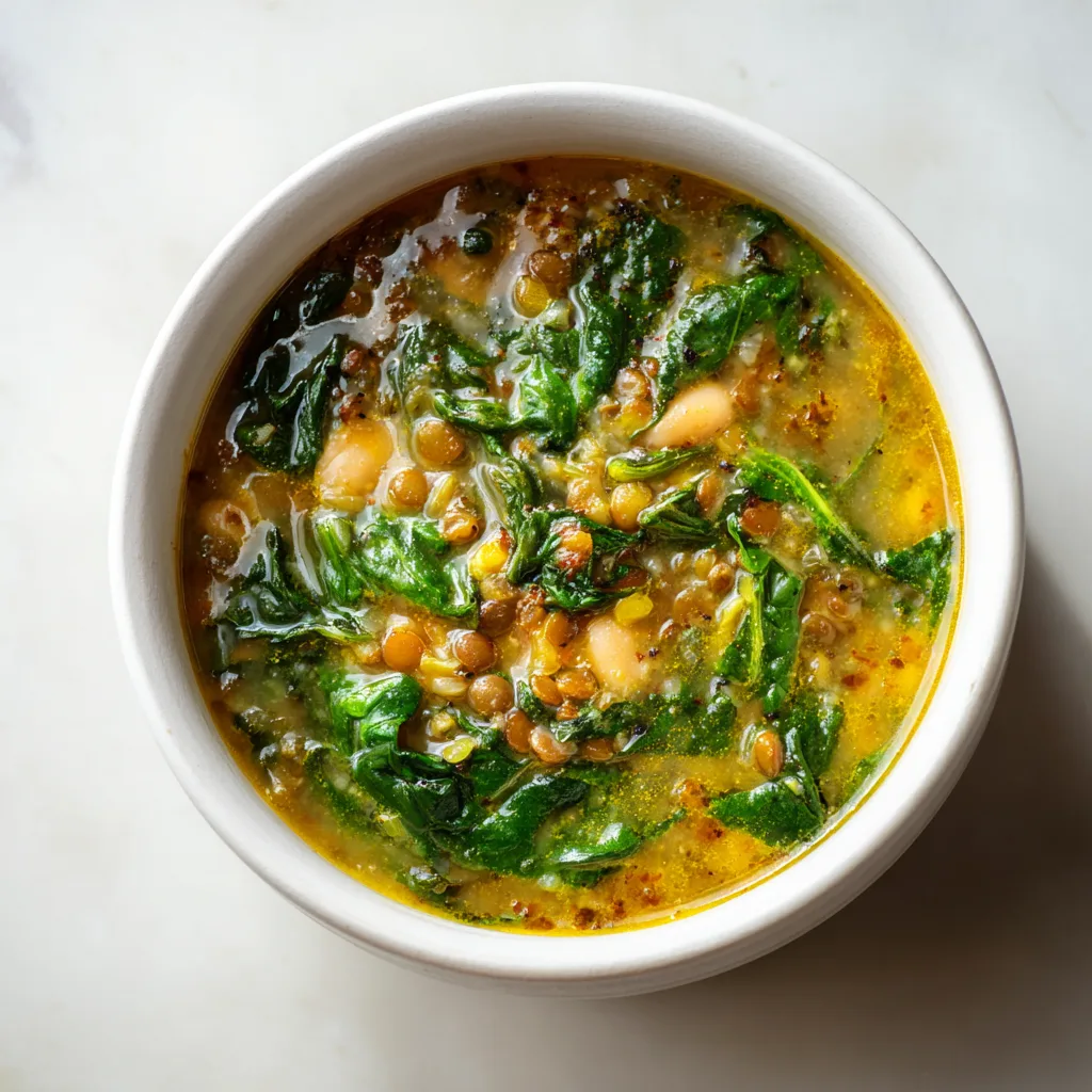 A hearty plant-based soup made with lentils, butter beans, and fresh spinach.