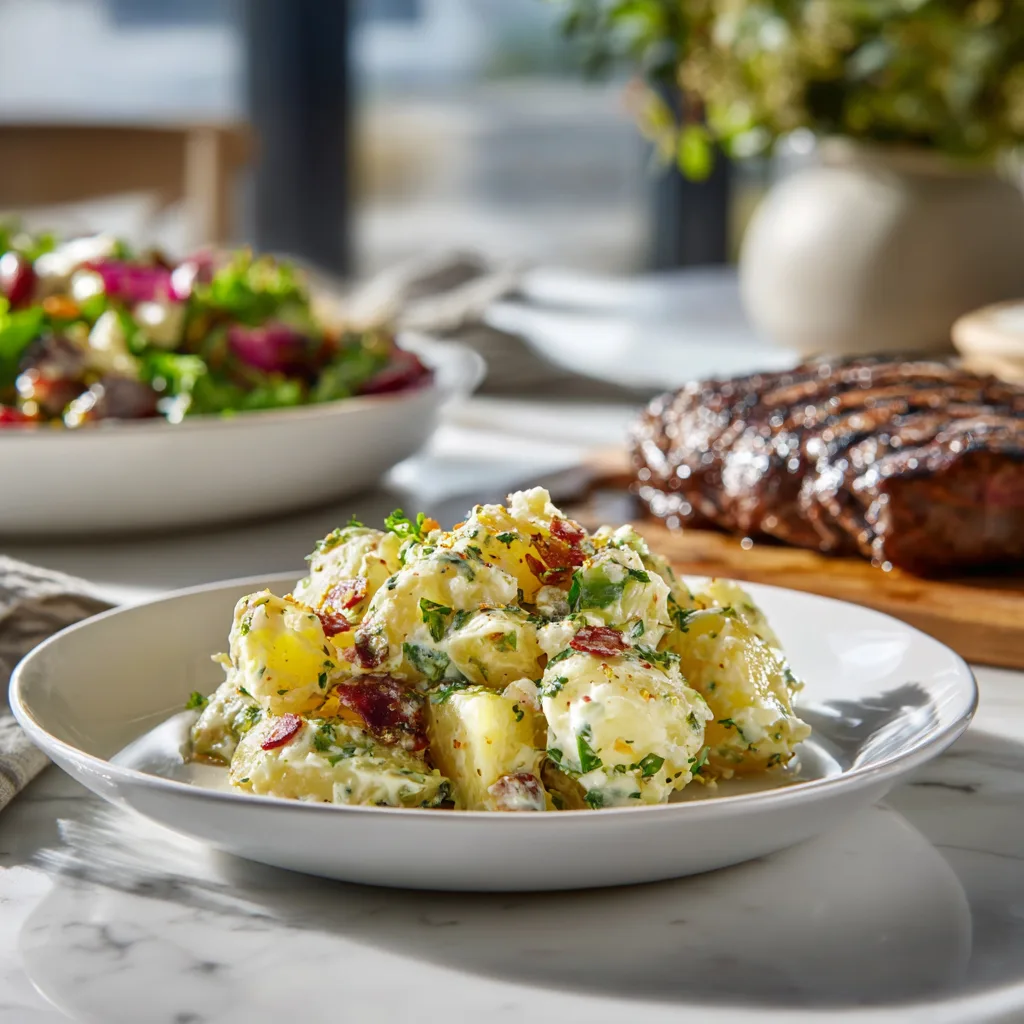 A creamy, loaded potato salad with bacon, cheddar cheese, and steakhouse-style dressing.