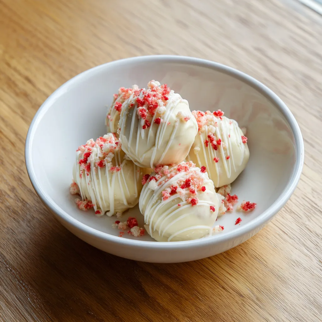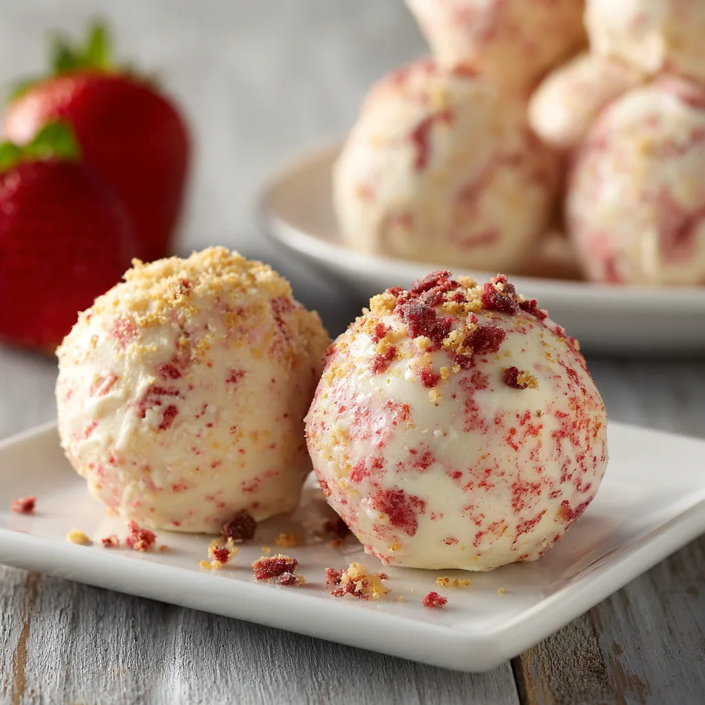 Soft, creamy strawberry shortcake truffles coated in white chocolate — an easy no-bake dessert perfect for parties and gifting.