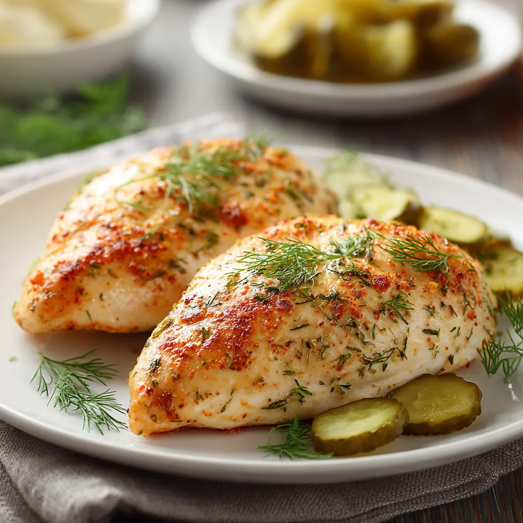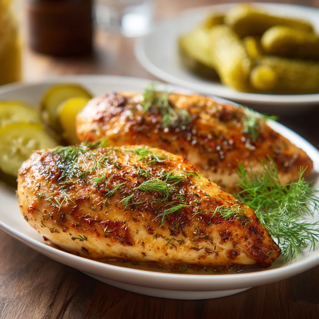 Juicy chicken breasts baked with a tangy dill pickle marinade and topped with a golden Parmesan-cheese crust.