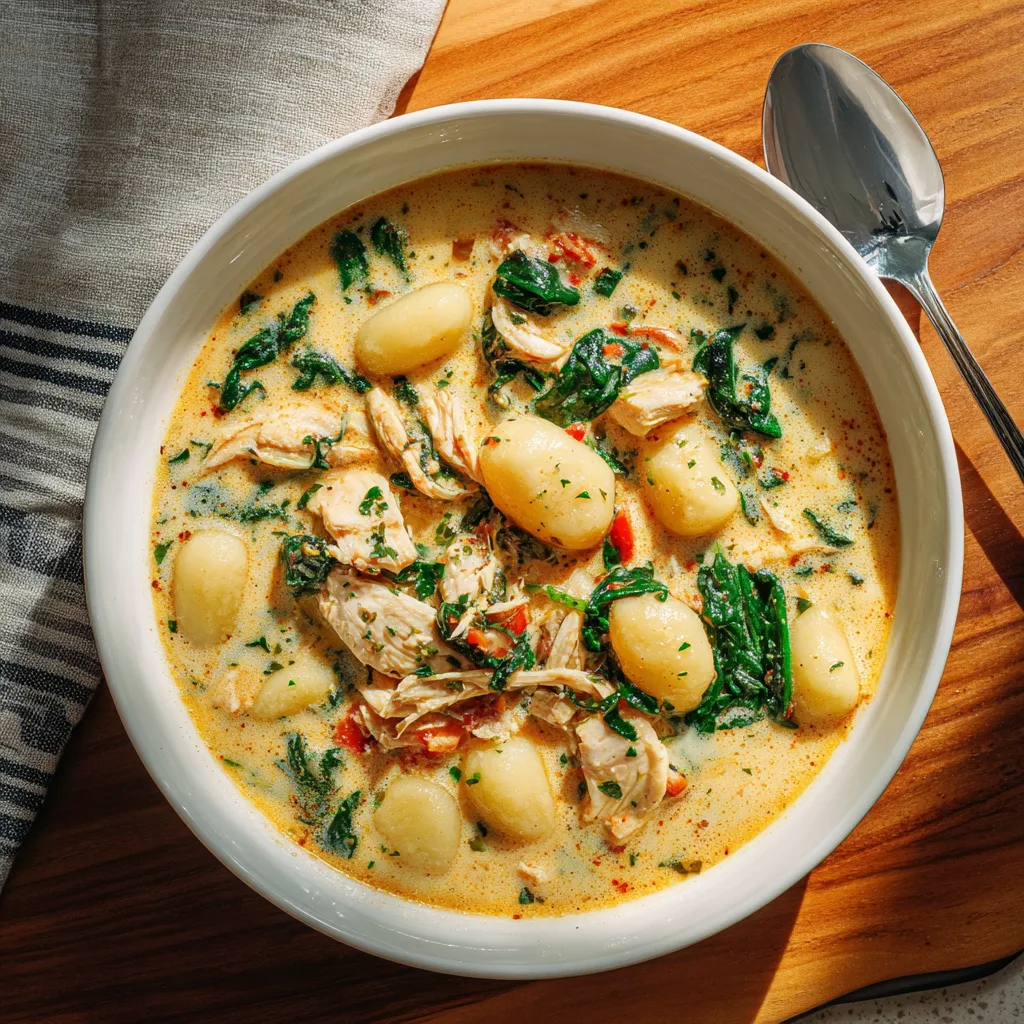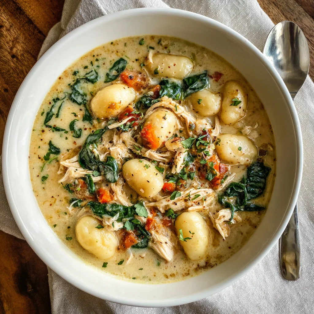 The soup combines tender chicken, soft gnocchi, sun-dried tomatoes, spinach, and creamy broth with aromatic Italian herbs. The flavors meld into a savory, comforting dish that could easily win over even the pickiest eaters.