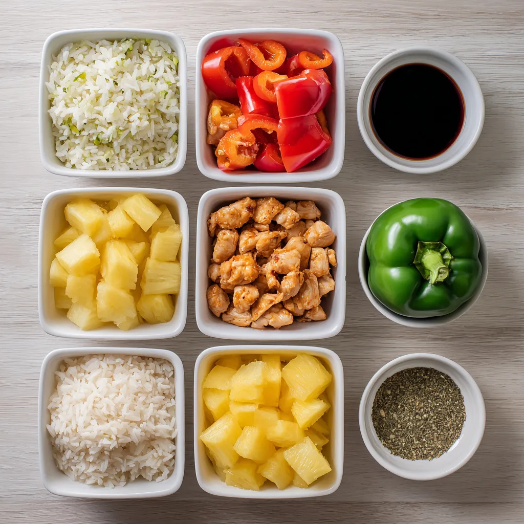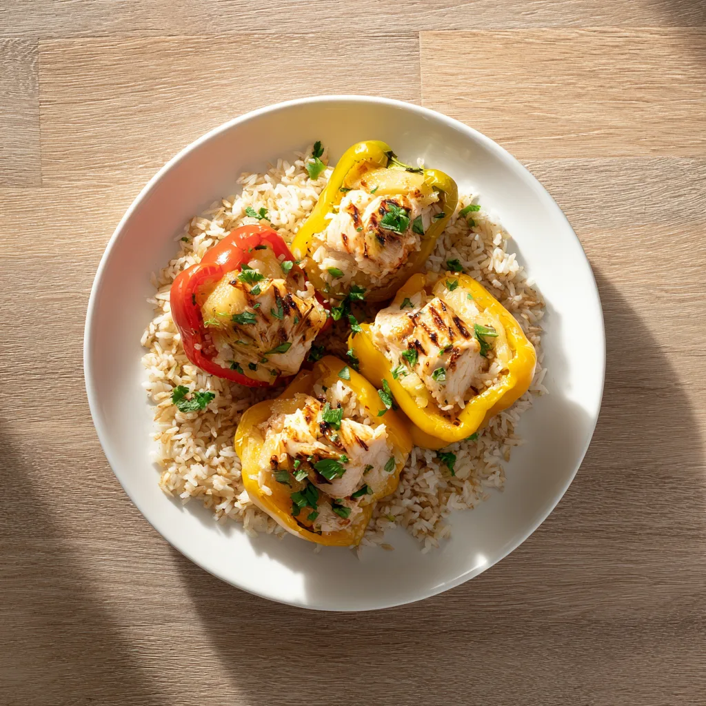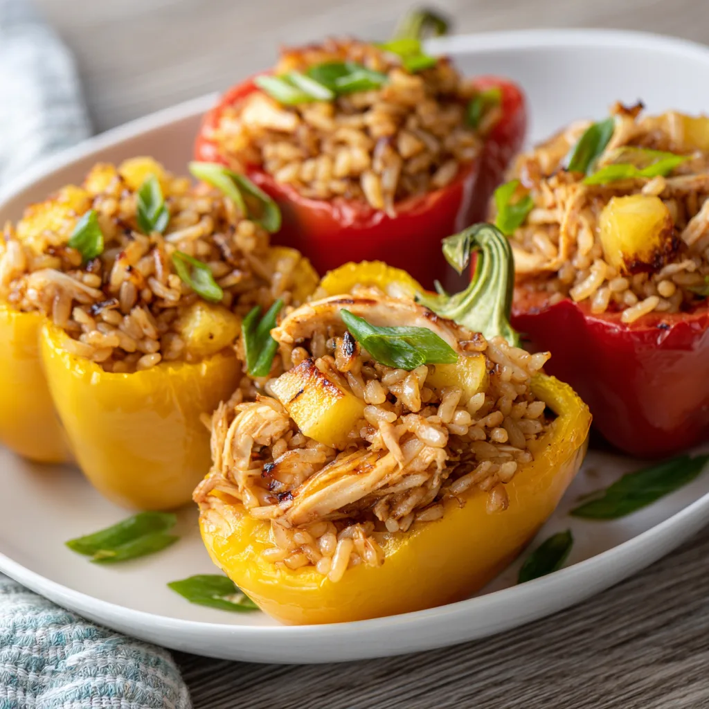 - Visual appeal: Bright peppers filled with golden rice, juicy chicken, and pineapple chunks.