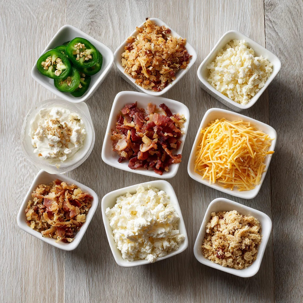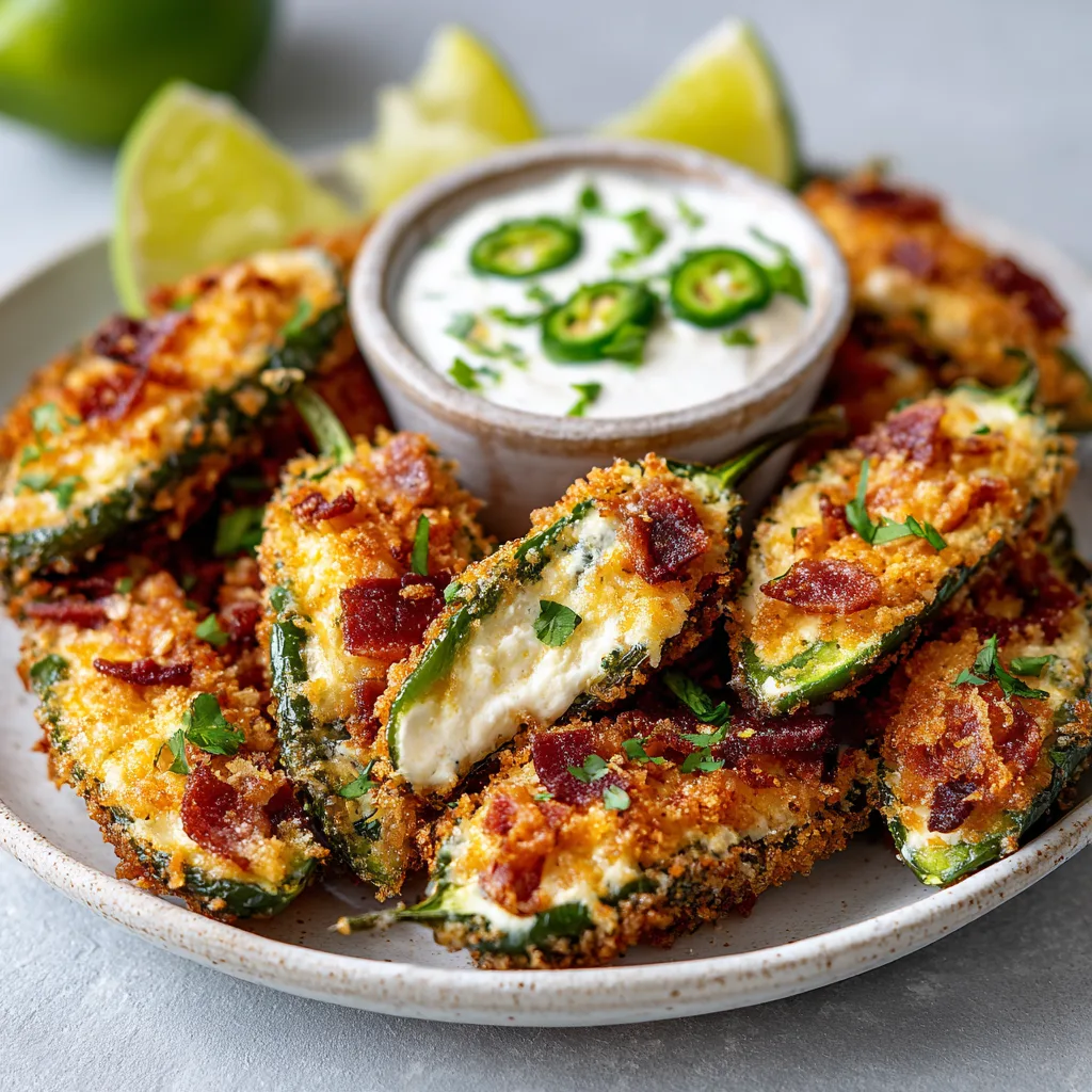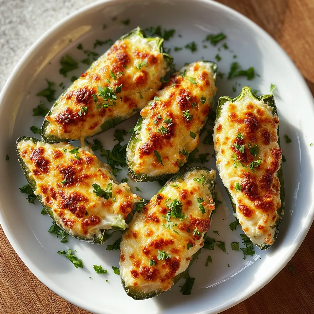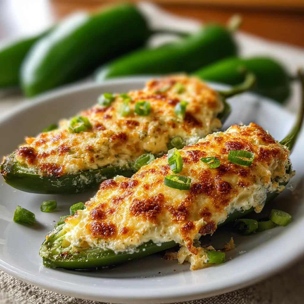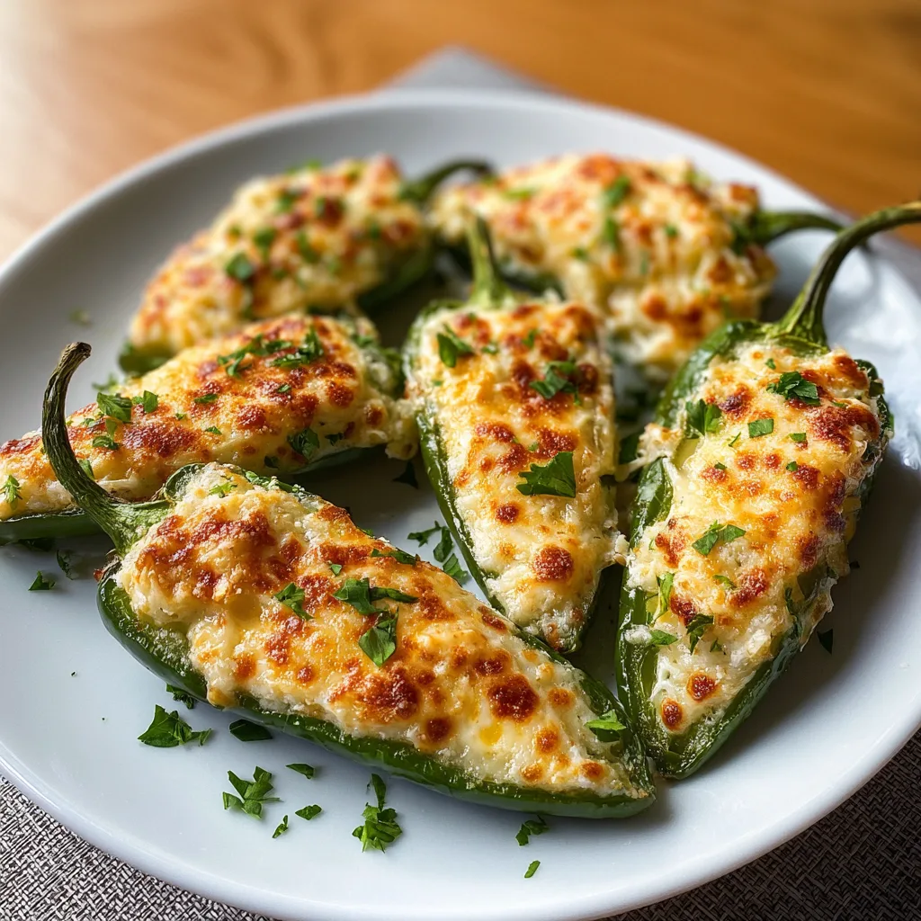 Spicy jalapeños stuffed with a creamy cheese filling, baked until bubbly and golden for the perfect appetizer or snack.