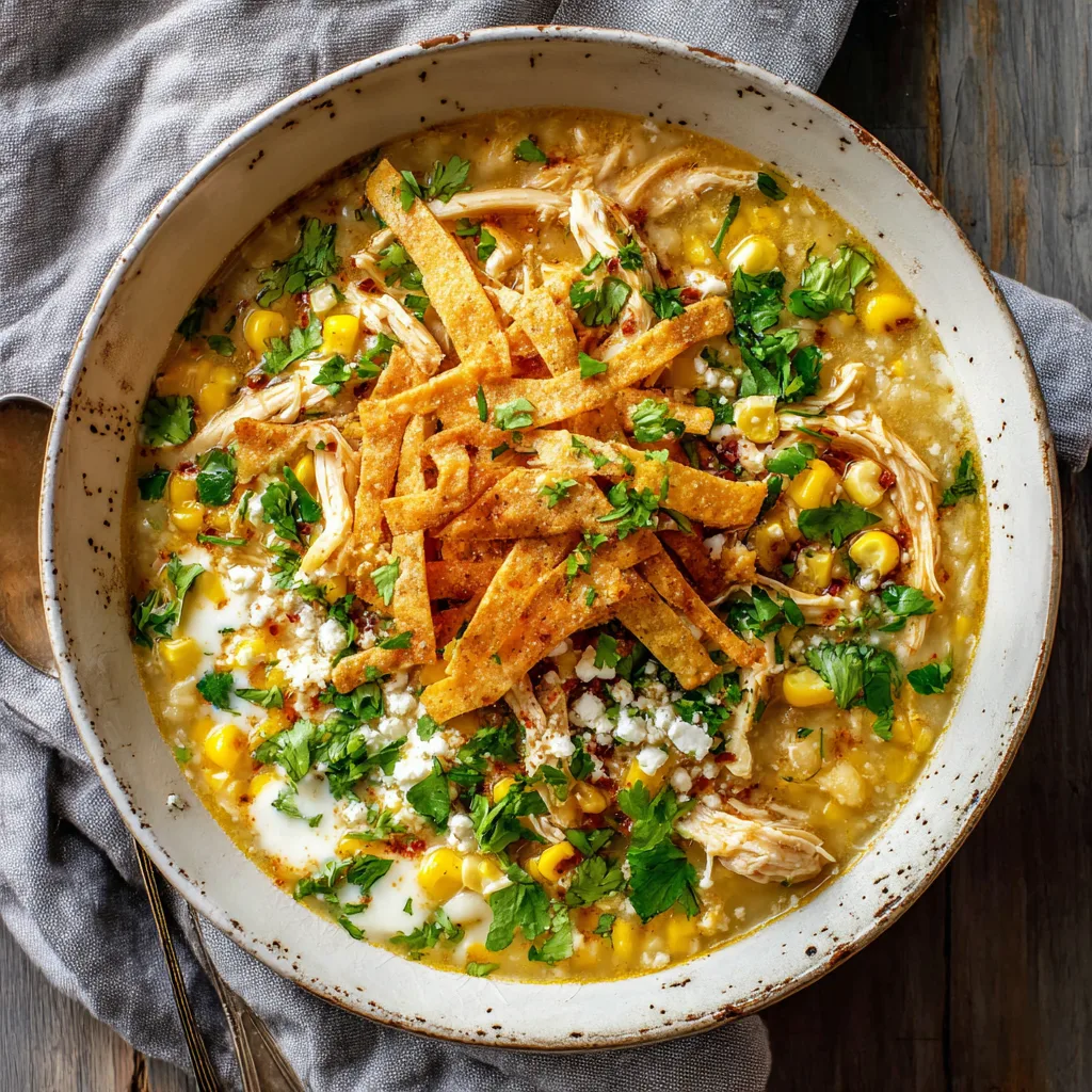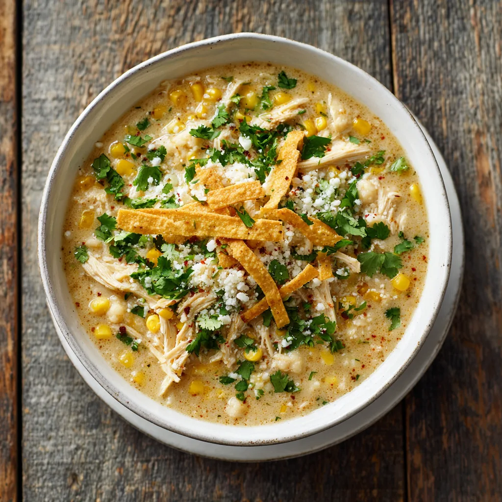 A mild, creamy, family-friendly white chicken chili inspired by Mexican street corn flavors with roasted corn, tender chicken, and warm spices.