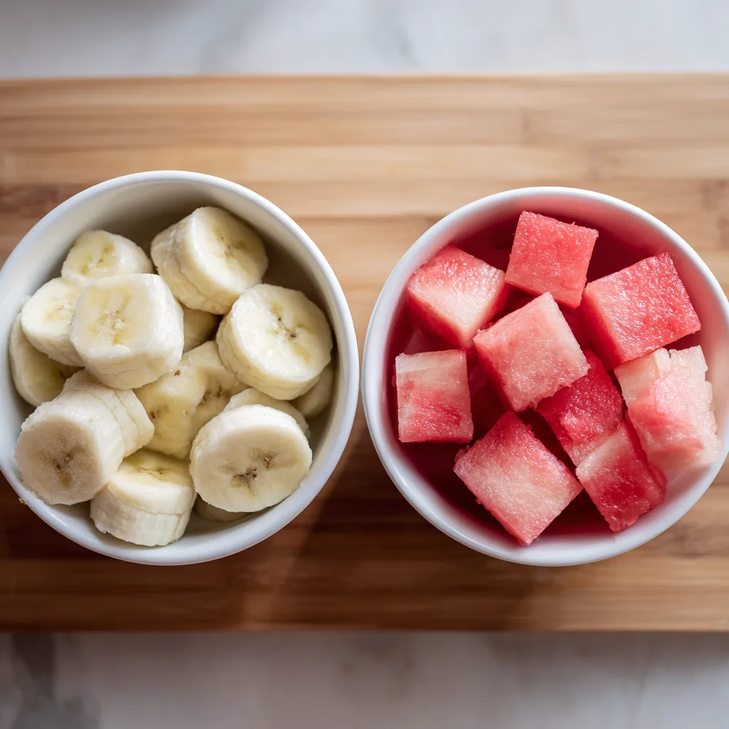 - Prepare the fruit: Remove seeds from the watermelon and dice into small chunks. Slice the banana evenly.