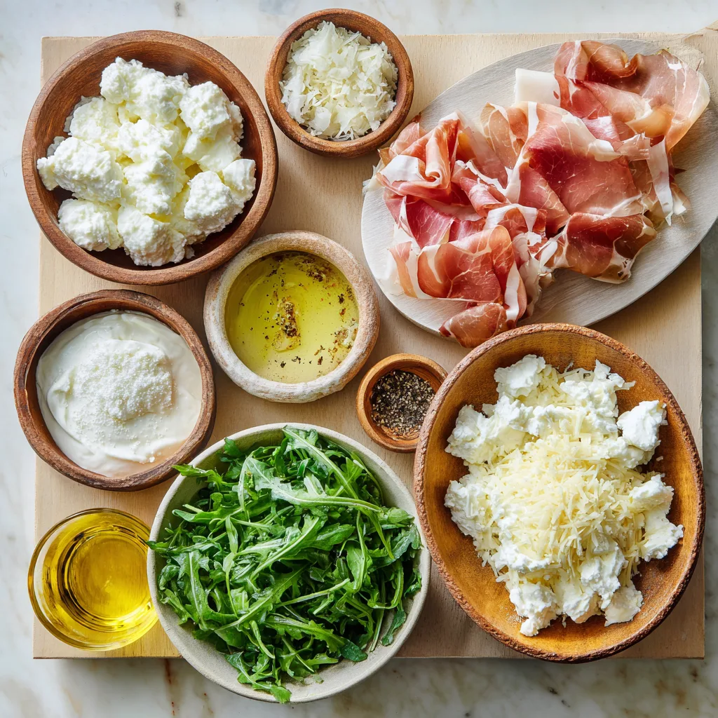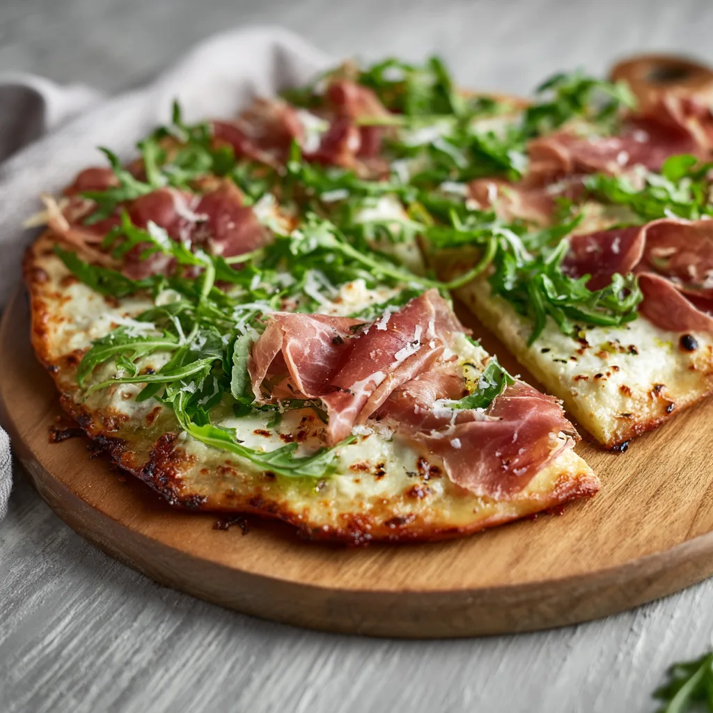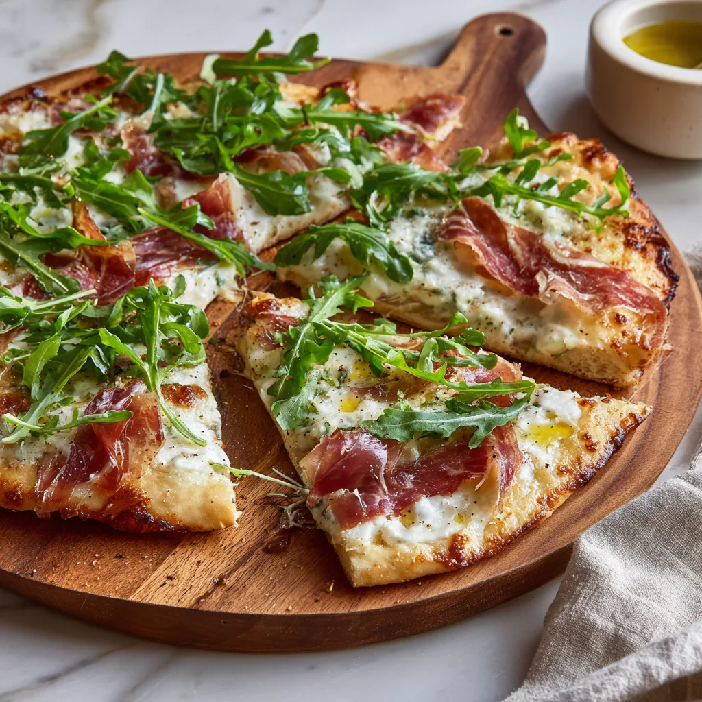 A gourmet white pizza with creamy ricotta, mozzarella, parmesan, tender prosciutto, and fresh arugula. Perfect for homemade restaurant-quality pizza nights.