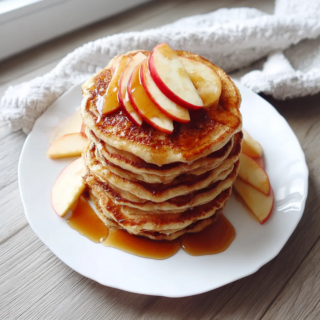 - Stack pancakes on a plate, top with apple slices, syrup, or whipped cream, and serve warm.
